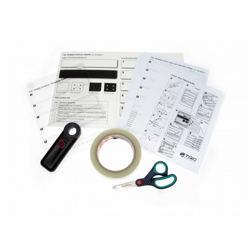 Zestaw do oceny zapylenia powierzchni. W zestawie znajduje się taśma, lupa, wzorzec zapylenia. Produkt zgodny z normą ISO 8502-3, JIS Z 0313.