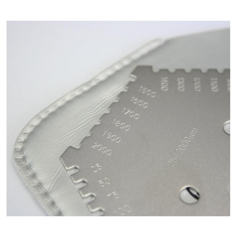Grzebień do pomiaru powłok mokrych został wykonany ze stali nierdzewnej. Posiada grawerowaną skalę. Zakres pomiaru od 25 do 2000 µm.
