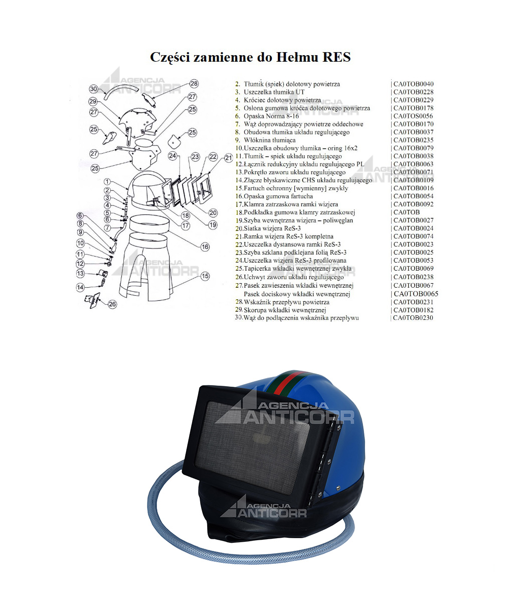 Hełm ReS-3 posiada zastosowanie tam gdzie na skutek warunków technicznych oraz dużego natężenia odbitych cząstek ścierniwa, (szybkie matowanie szkła szyby) konieczna staje się cząsta wymiana zewnętrznej szyby szklanej, bez przerywania pracy np. w ładowniach statków, zbiornikach. Otwarcie wizjera w celu wymiany szyby szklanej lub siatki stalowej, nie powoduje rozszczelnienia hełmu. Wewnętrzna szyba z poliwęglanu utrzymana jest w profilowanej rozprężnej uszczelce gumowej. Wizjer zamyka ramka wykonana ze stopu aluminium, przytwierdzona na zawiasach do korpusu hełmu.