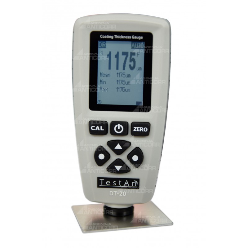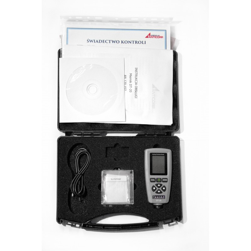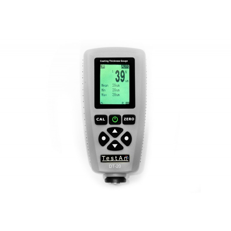 Miernik grubości powłok Testan DT-20 ze zintegrowaną sondą służy do pomiaru na podłożach ferro i nieferromagnetycznych. Automatycznie rozpoznaje rodzaj podłoża. Do urządzenia dołączone jest oprogramowanie umożliwiające transfer danych do komputera poprzez port USB (wyniki i grupy wyników przesyłane są w postaci pliku tekstowego).