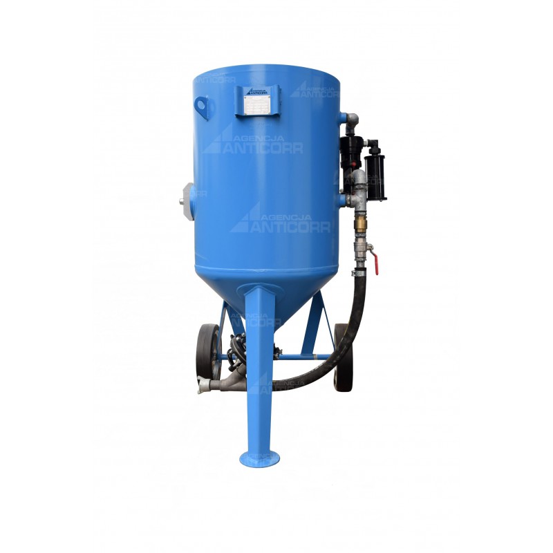 Piaskarka o pojemności 200 litrów uzbrojona w zawór do ścierniwa talerzowy FSV, układ dekompresujący RMC-2000.