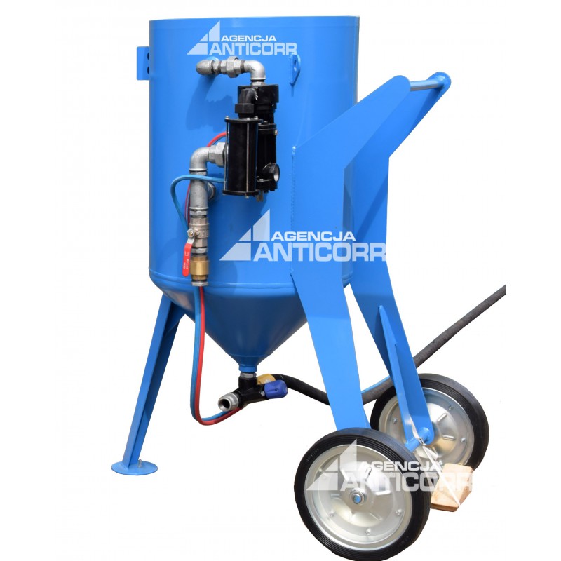 Piaskarka o pojemności 200 litrów uzbrojona w zawór do ścierniwa PTC MICRO, układ dekompresujący RMC-2000, wąż do piaskowania FI25 o długości 20MB, wąż do sterowania pneum.21MB z dźwignią RLX-III i dyszą do piaskowania CTXA (średnica do wyboru).