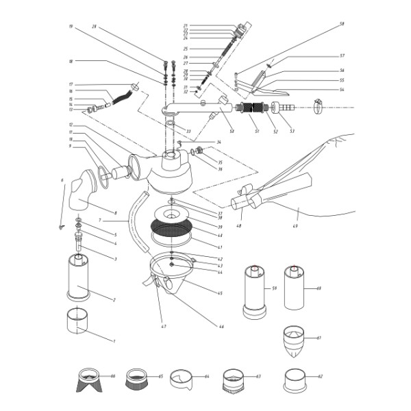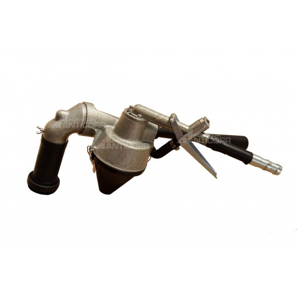 Podczas gdy zawór podwójny jest całkowicie otwarty, sprężone powietrze przedostające się do urządzenia zostaje podzielone na dwa strumienie. Pierwszy strumień przechodzi przez dyszę nadmuchową. Podciśnienie wykorzystywane do doprowadzenia śrutu przez wąż materiałowy do dyszy roboczej, wytwarzane jest przez inżektor dyszy nadmuchowej dyszy roboczej. Doprowadzone w ten sposób do dyszy roboczej ścierniwo zostaje rozprowadzone w strumieniu sprężonego powietrza tworząc strumień czyszczący.
