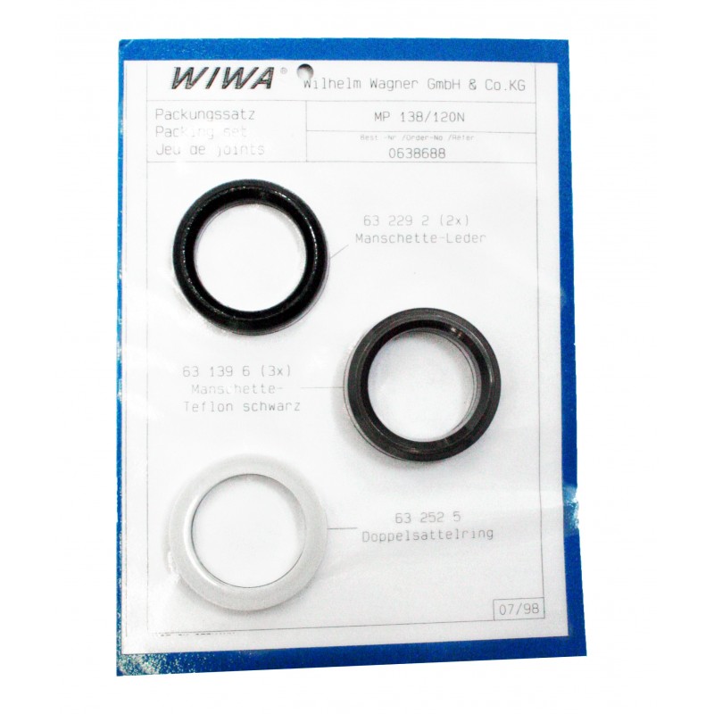 Zestaw uszczelnień firmy WIWA do pomp malarskich. W skład zestawu wchodzi komplet uszczelnień: skórzany pierścień uszczelniający, teflonowy pierścień uszczelniający (czarny) i pierścień do zmiany kierunku (biały).